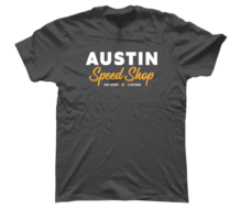 Our “Speed” logo printed on the chest of a soft , 100% cotton Comfort Colors shirt in Pepper.